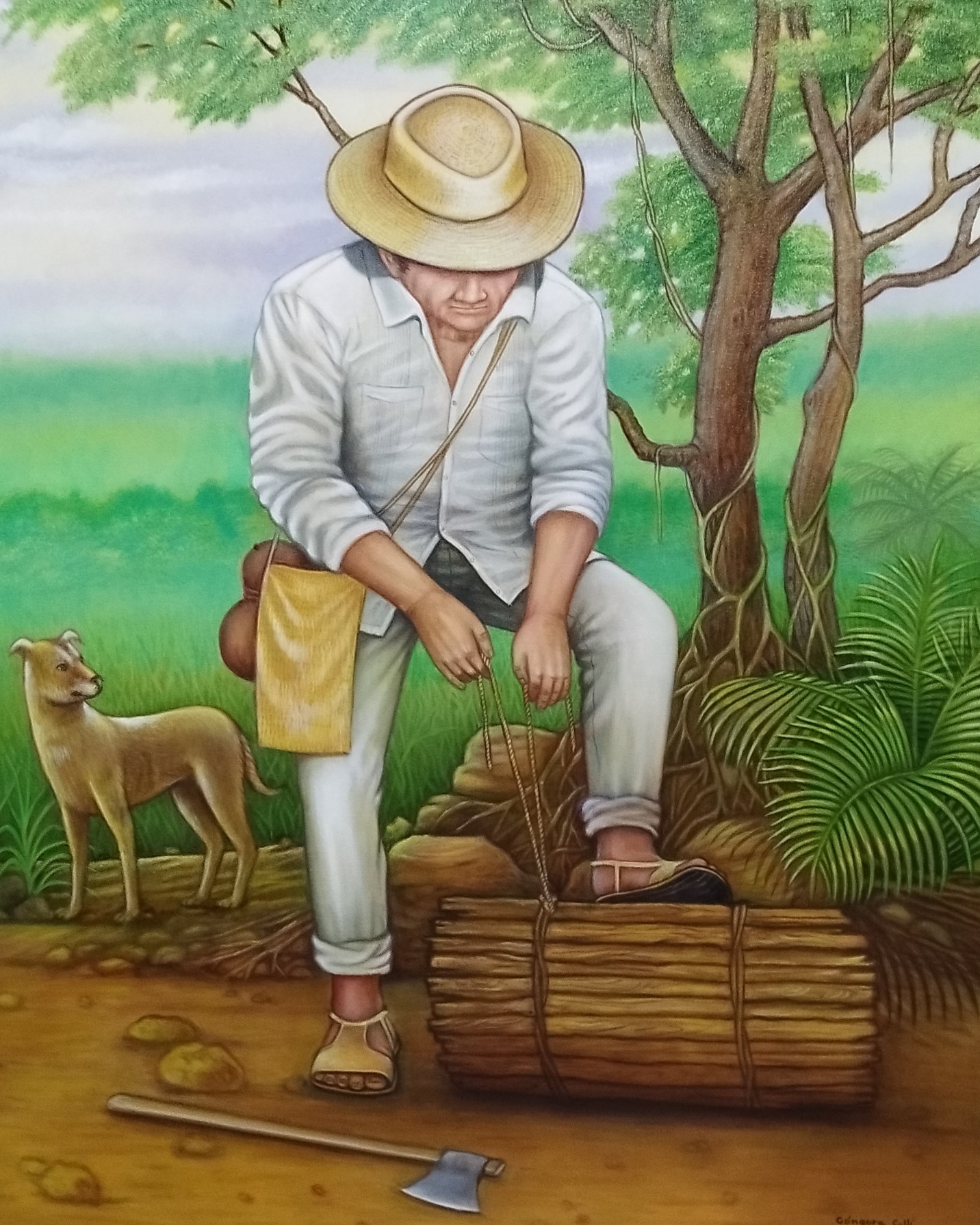 "El leñador" es una obra que retrata la dedicación y el esfuerzo del trabajo en la naturaleza. Pintada en óleo sobre lienzo, esta escena muestra a un hombre en plena labor, atando cuidadosamente un manojo de leña recién cortada, mientras su fiel perro lo acompaña. La atención al detalle en la figura del leñador, su postura, y las herramientas que lo rodean, resaltan el compromiso con su trabajo.