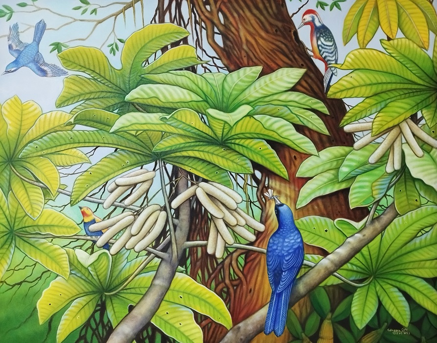 "Bosque alegre" es una obra que captura la vitalidad y el colorido de la vida silvestre en su máximo esplendor. Pintada en óleo sobre lienzo, esta pieza retrata una escena llena de movimiento y alegría, donde un grupo de aves se posa entre el follaje de un bosque tropical. Las hojas verdes y las coloridas plumas de las aves se combinan para crear una atmósfera de energía y vida.