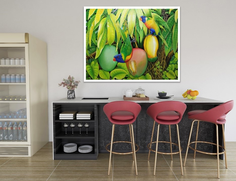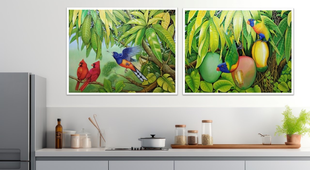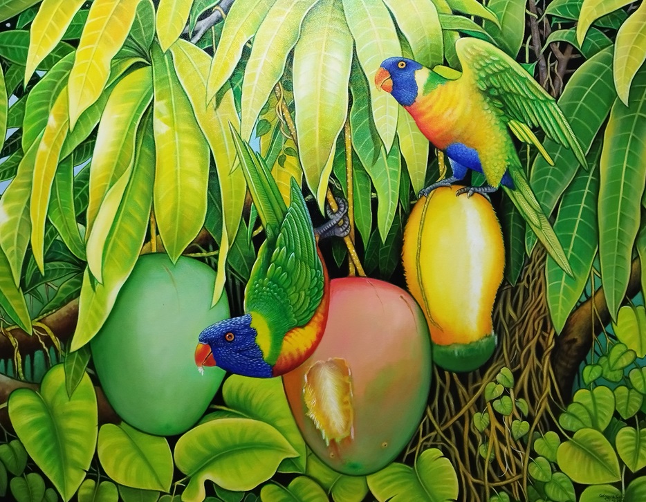 "Loritos arcoíris" es una obra que explota en color y vida, capturando la belleza de la naturaleza en su forma más vibrante. Pintada en óleo sobre lienzo, esta pieza muestra a dos loritos de colores brillantes posados sobre mangos maduros, rodeados por la exuberante vegetación tropical. Cada detalle, desde las plumas de los loros hasta la textura de las frutas, está cuidadosamente elaborado para resaltar la riqueza visual de la escena.