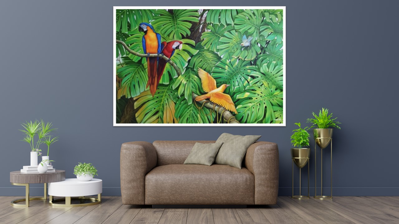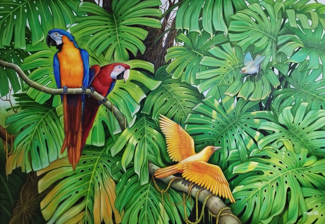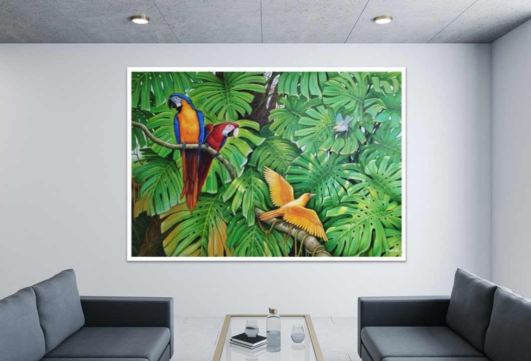 "Monstera deliciosa" es una obra de gran tamaño que destaca la majestuosidad de la naturaleza a través de la imponente vegetación tropical y la presencia vibrante de aves exóticas. Realizada en óleo sobre lienzo, esta pintura captura la exuberancia de las hojas de la planta Monstera, que dominan la escena con su verdor intenso. Sobre sus ramas, un par de guacamayas se posan con elegancia mientras un pájaro dorado despliega sus alas, aportando dinamismo y color a la composición.