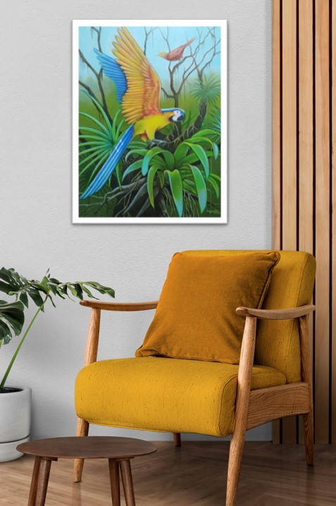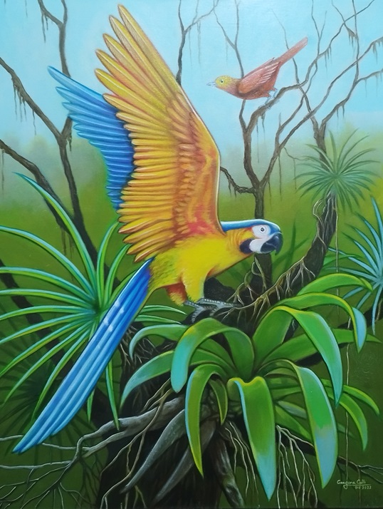 En el fondo, se observa a otro pájaro que parece estar vigilando o acompañando la escena, lo que añade una capa adicional de interacción y comunidad entre las criaturas del bosque. Esta obra no solo celebra la belleza de estas aves, sino que también simboliza el ciclo natural de la vida y la importancia del hogar en la naturaleza. "Anidar" es una evocación visual de la paz y la conexión que se encuentran en el corazón de la jungla, invitando al espectador a reflexionar sobre la armonía y la interdependencia del mundo natural.