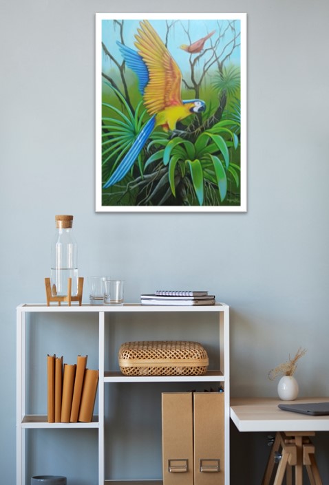 "Anidar" es una obra que captura un momento de la vida silvestre en su estado más puro. La pintura presenta un colorido loro con sus alas extendidas, en el preciso instante en que se prepara para anidar en lo alto de un árbol en el bosque. Los colores brillantes del loro contrastan con el verdor intenso del entorno, destacando su presencia y la majestuosidad de la naturaleza. Cada detalle, desde las plumas del loro hasta las hojas, está cuidadosamente elaborado para transmitir la vitalidad y la energía del bosque.